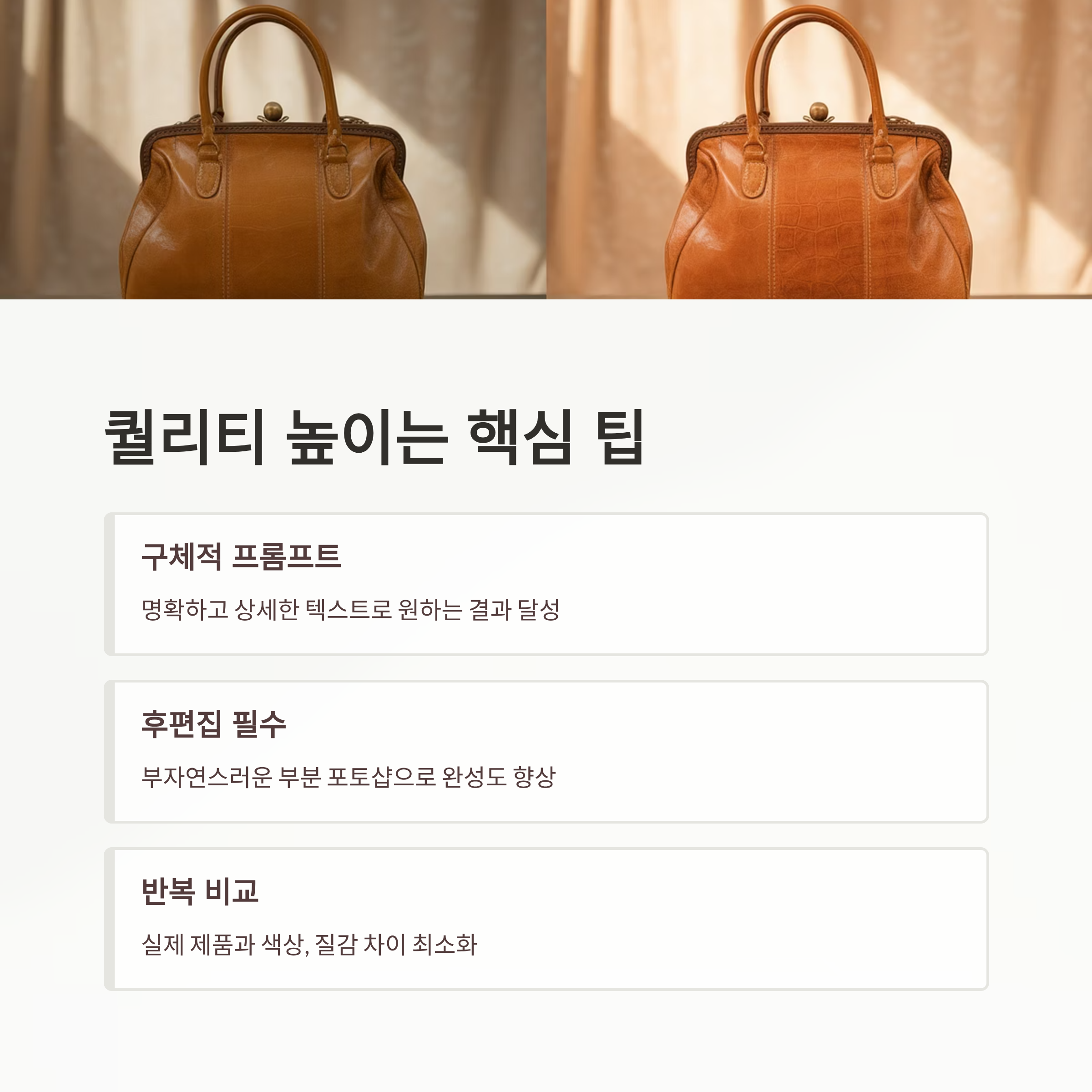 - 텍스트 프롬프트 작성: 제품의 고유 요소와 원하는 배경, 분위기를 상세하게 기술