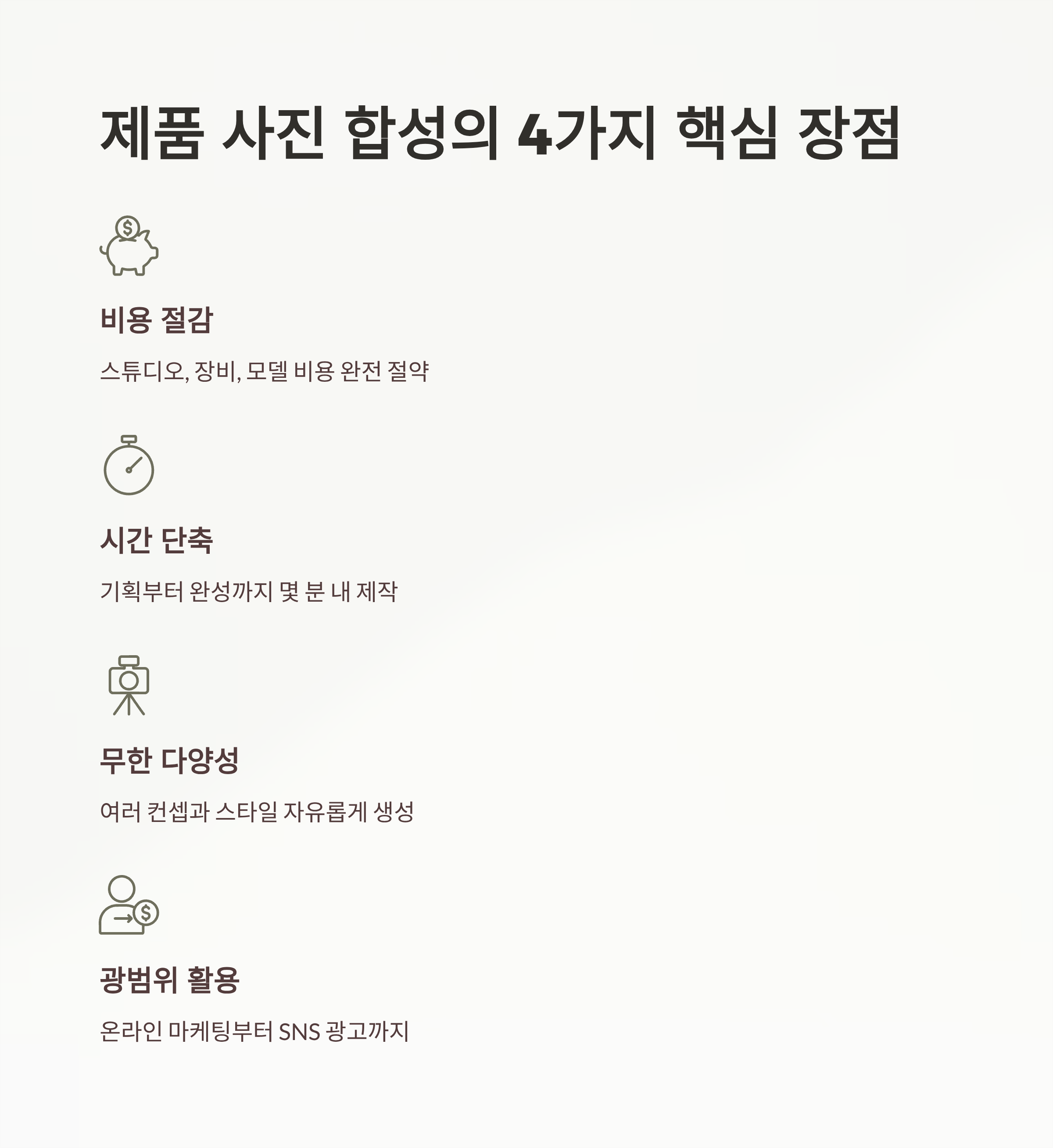 - 비용 절감: 스튜디오 대여, 장비, 모델, 촬영 인력 비용 절약 가능