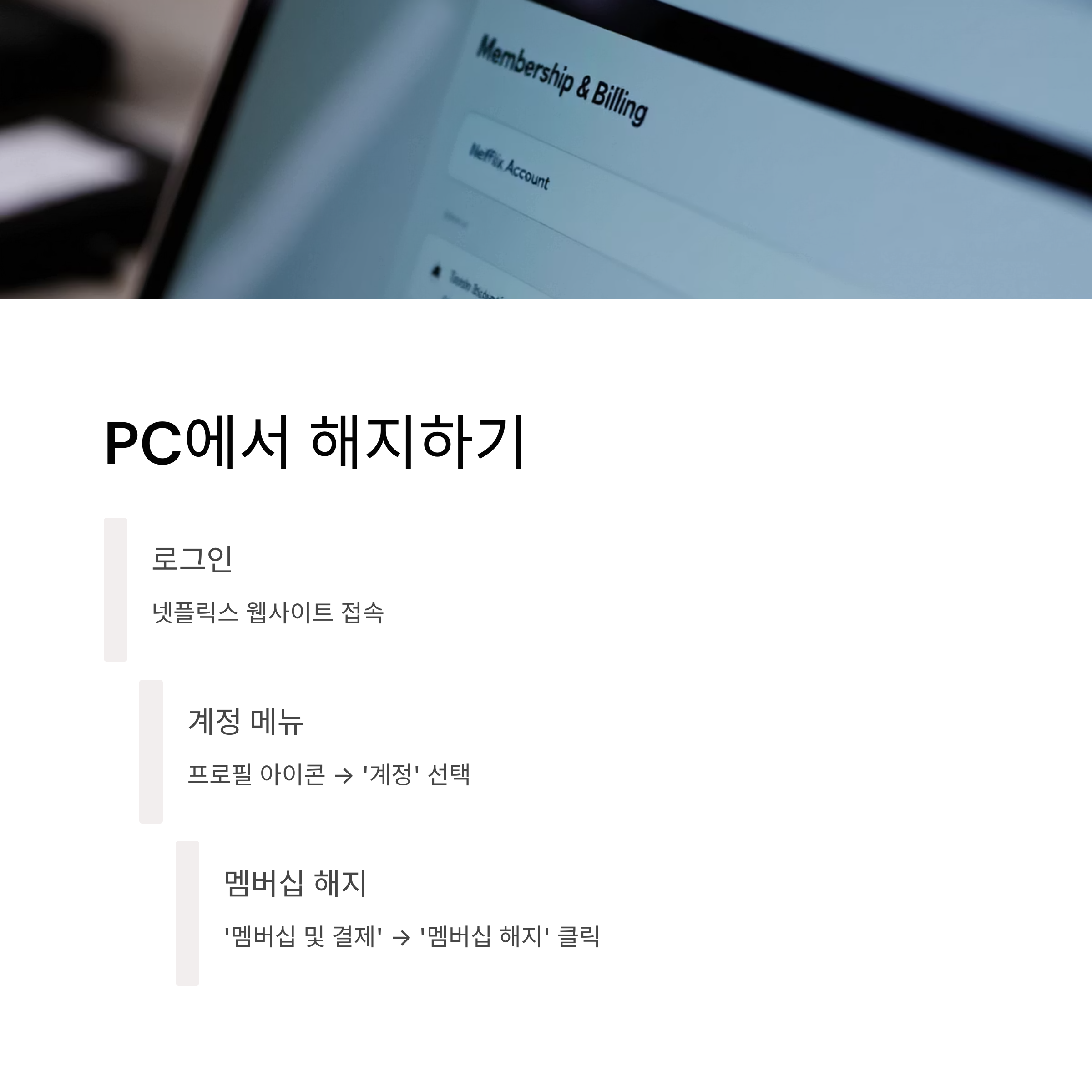 **PC에서 해지하는 방법:** 1. 넷플릭스 웹사이트 접속 후 로그인 2. 우측 상단 프로필 아이콘 클릭 → '계정' 선택 3. '멤버십 및 결제' 섹션에서 '멤버십 해지' 클릭 4. 해지 사유 선택 후 '해지 완료' 버튼 클릭 **모바일에서 해지하는 방법:** 앱에서는 직접 해지가 안 되고, 브라우저로 연결돼요. '나의 넷플릭스' → 메뉴 → '계정'을 선택하면 웹페이지로 이동하면서 위와 동일한 절차를 따르면 됩니다.