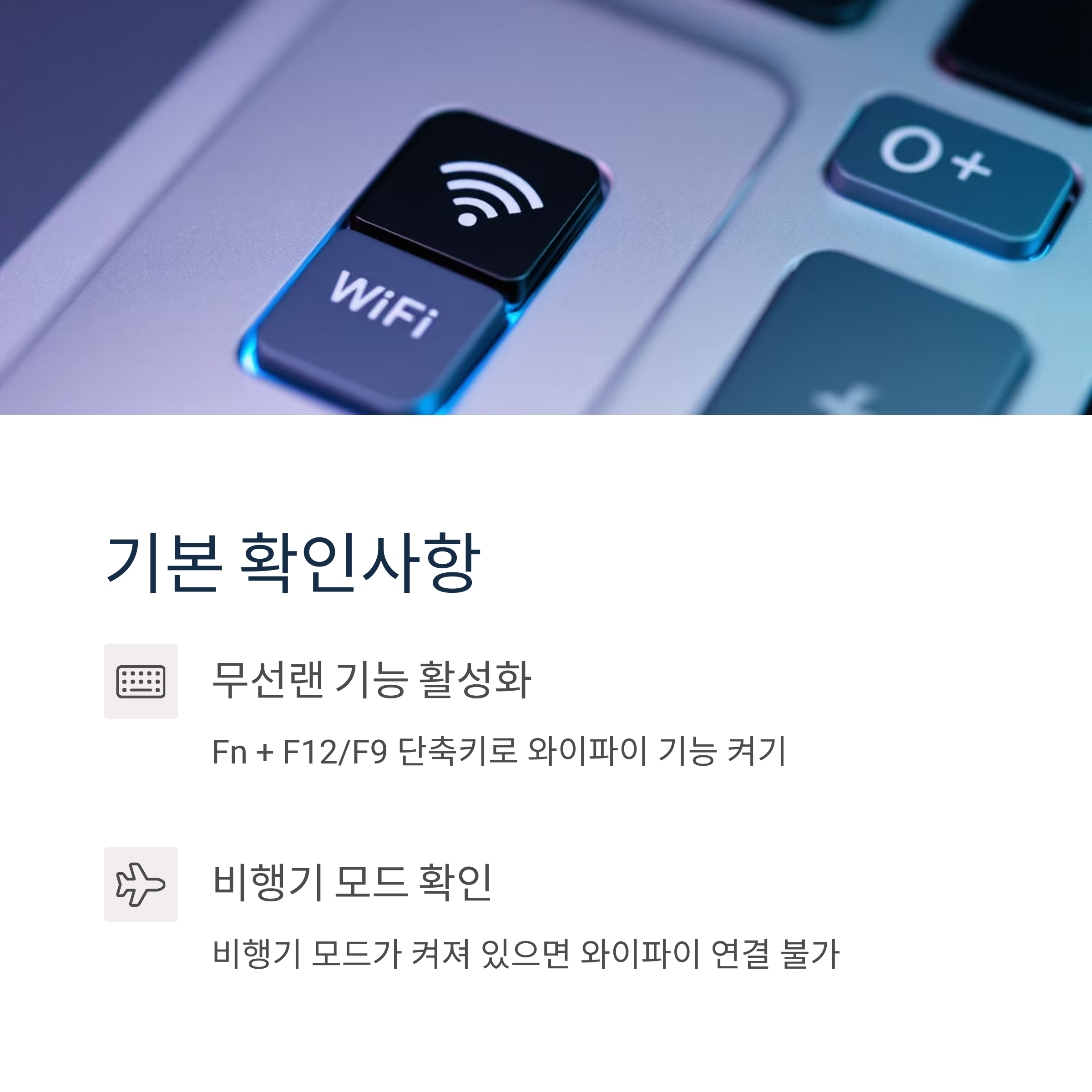 - 키보드 단축키 확인: 대부분의 노트북에는 와이파이를 켜고 끄는 단축키가 있습니다. 보통 "Fn" 키와 F1~F12 중 하나(주로 F12나 F9)를 동시에 눌러 사용합니다[4][10]. 해당 키에는 비행기나 안테나 모양 아이콘이 그려져 있는 경우가 많습니다.
