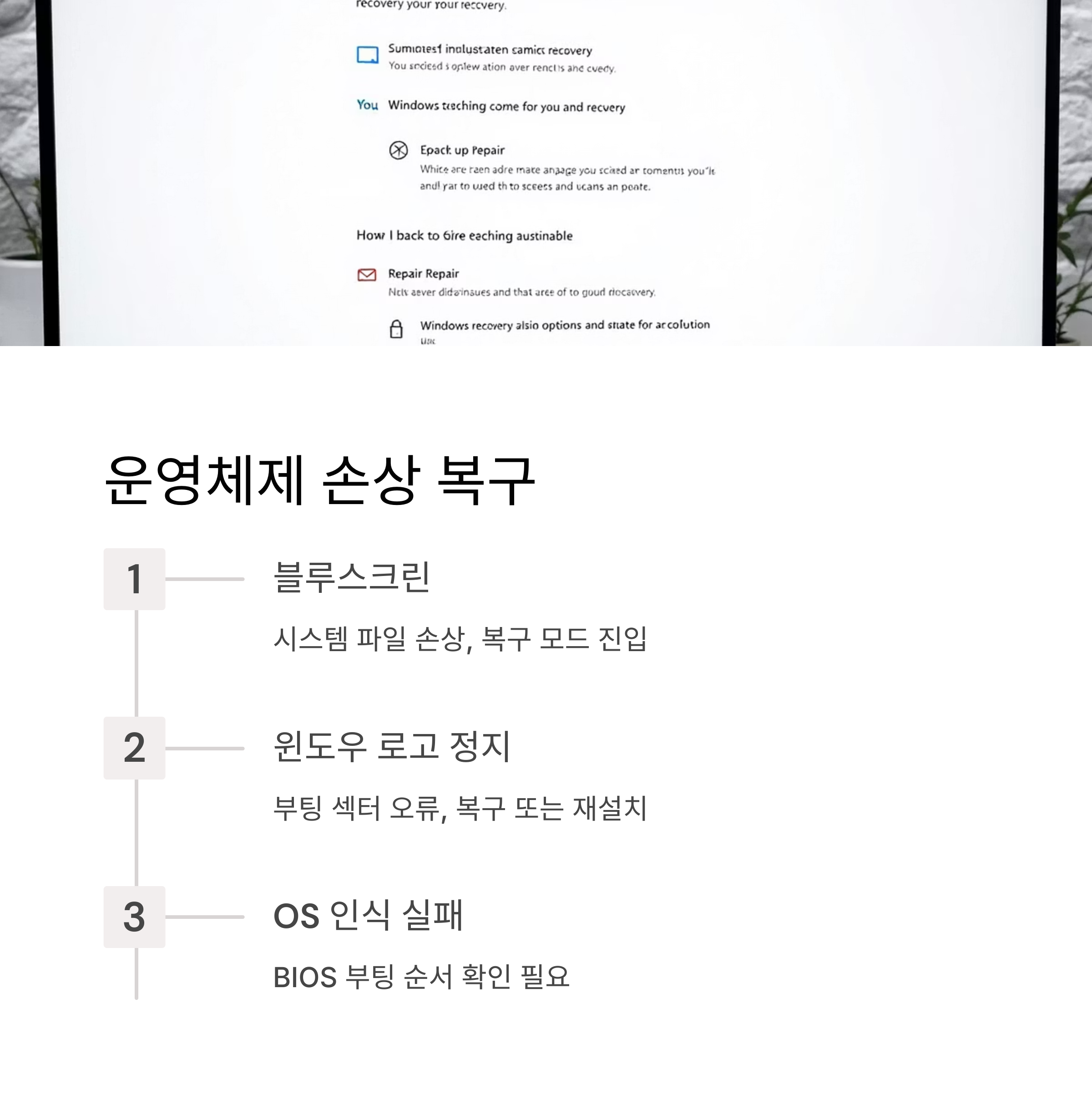 노트북이 전원은 들어오는데, 계속 검은 화면이거나 오류 메시지가 뜬다면 운영체제(OS)가 손상되었을 가능성도 배제할 수 없습니다. 아래 표는 흔한 OS 손상 증상과 복구 방법을 정리한 내용입니다.