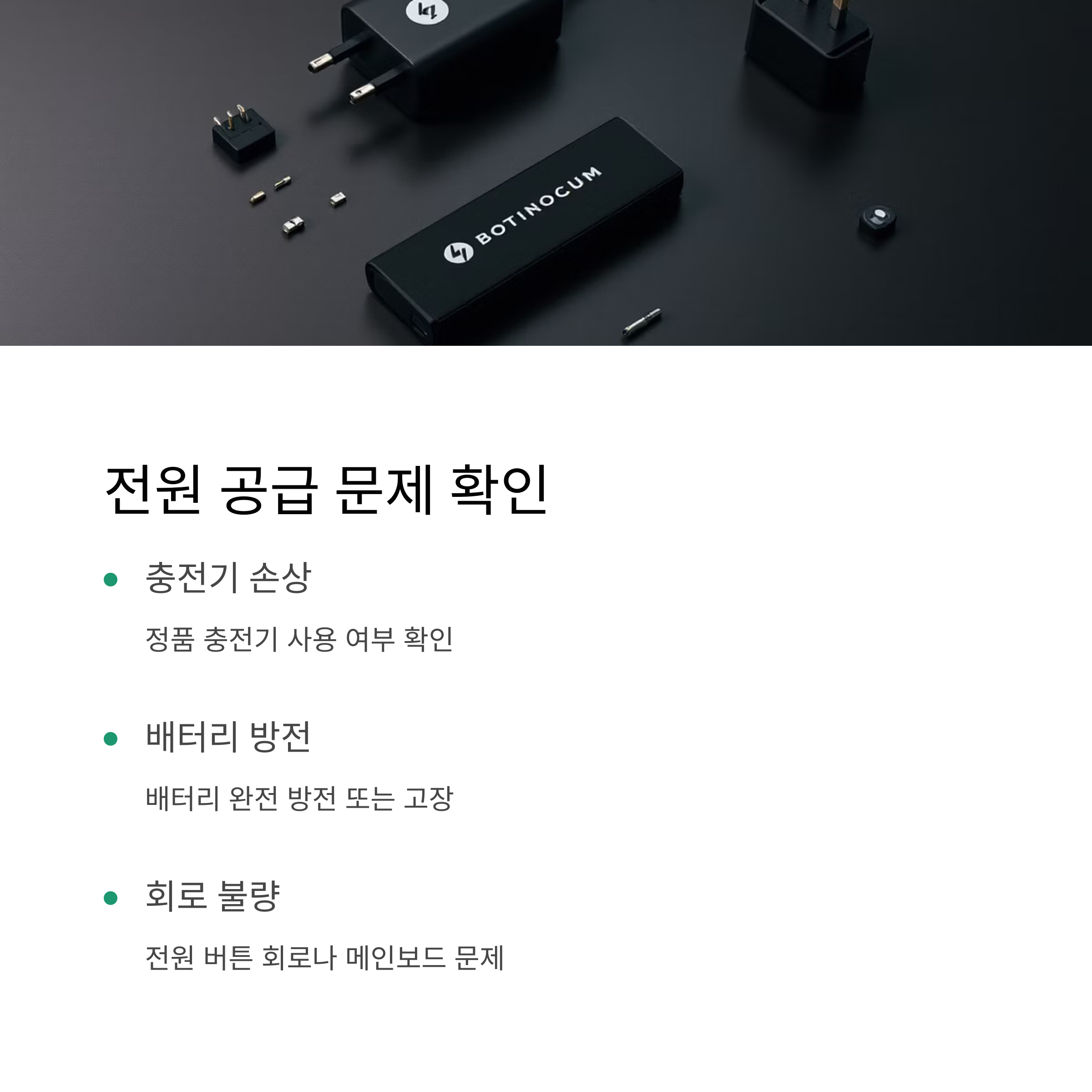 충전기 문제, 배터리 방전, 전원 회로 고장 등 다양한 원인이 있어요. 먼저 정품 충전기 사용 여부부터 확인해보세요.