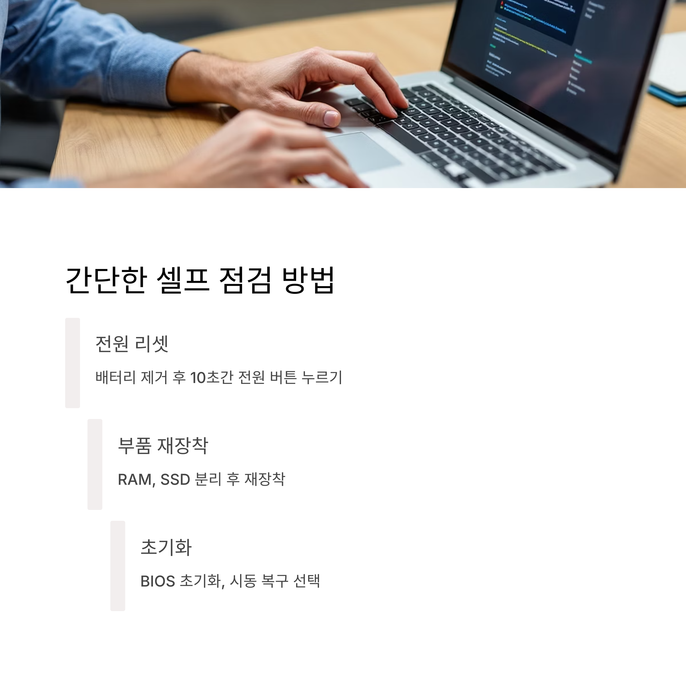 배터리 분리 후 전원 리셋, 램 재장착, 외부 장치 제거 등은 누구나 해볼 수 있는 기본 점검이에요. 꼭 먼저 해보세요!