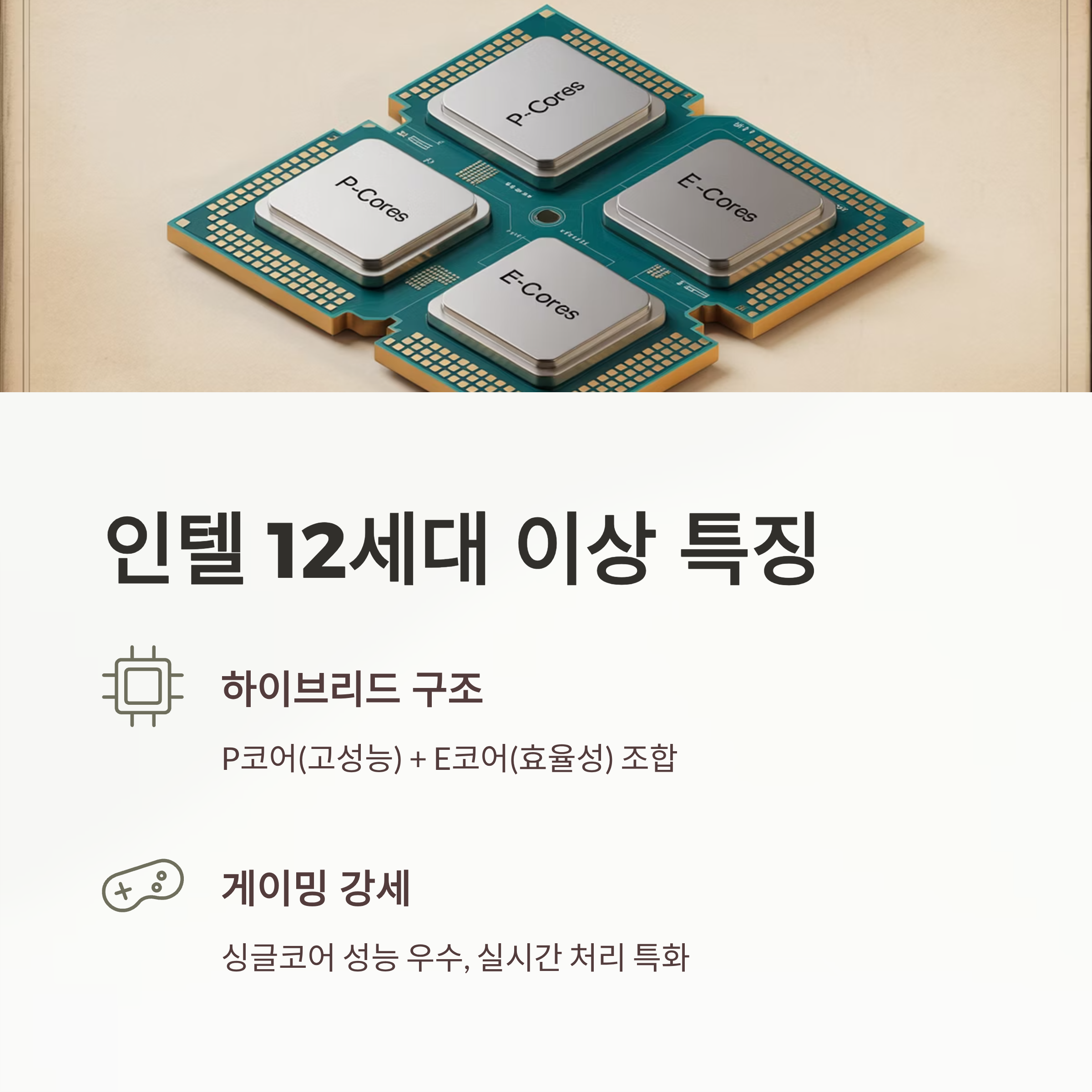 - E코어(Efficiency Core): 백그라운드 작업과 멀티태스킹 담당