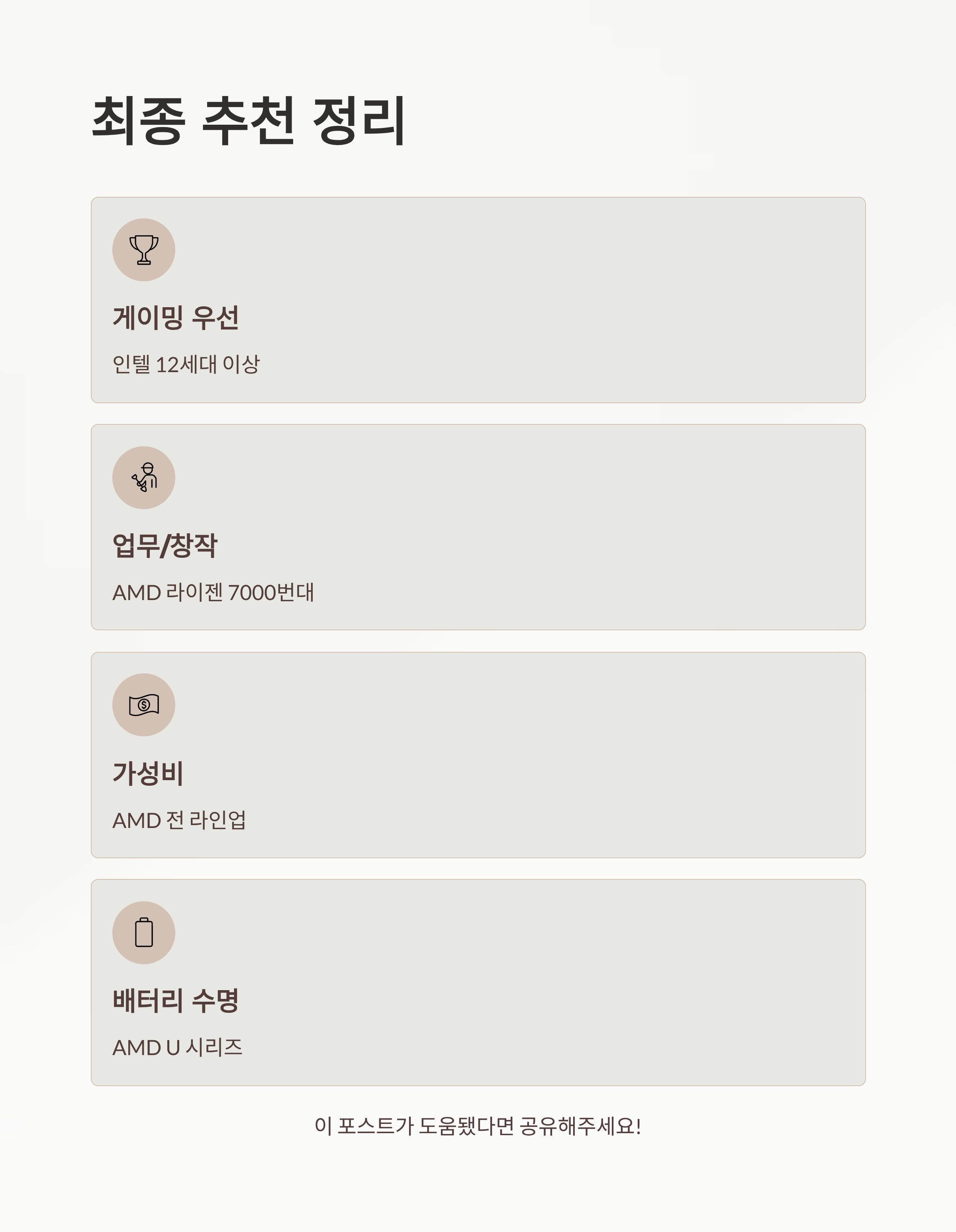 2025년 노트북 CPU 선택은 용도에 따라 명확하게 나뉩니다. 게임 성능을 최우선으로 한다면 인텔 12세대 이상, 종합적인 성능과 전력 효율을 중시한다면 AMD 라이젠 7000번대 이상을 선택하시면 됩니다.