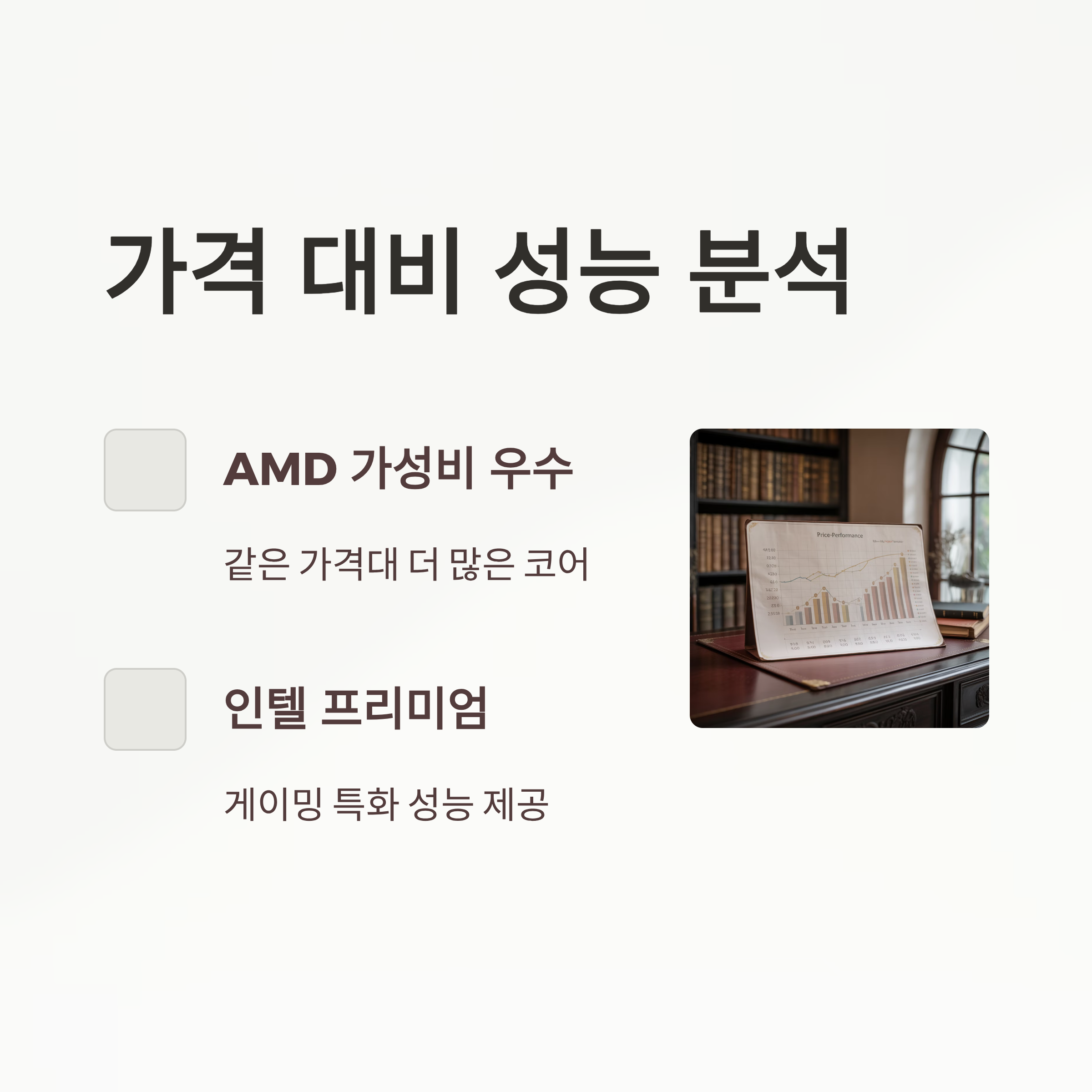 - AMD가 전반적으로 가성비 우수: 같은 가격대에서 더 많은 코어와 스레드 제공