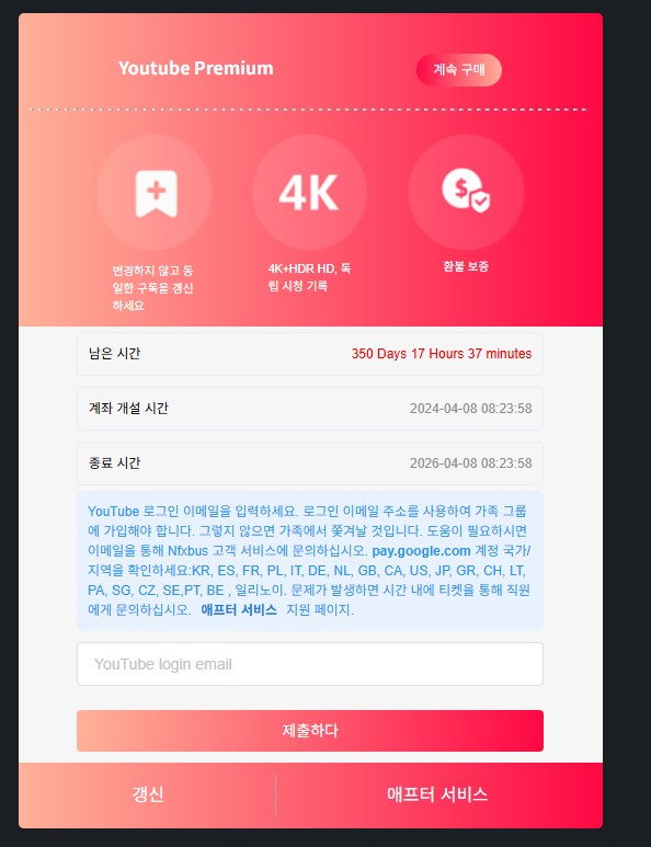 - 결제 후, 구독 페이지에서 구글 계정 정보를 입력하면 끝! 저는 메인 계정 대신 서브 계정을 사용했어요.