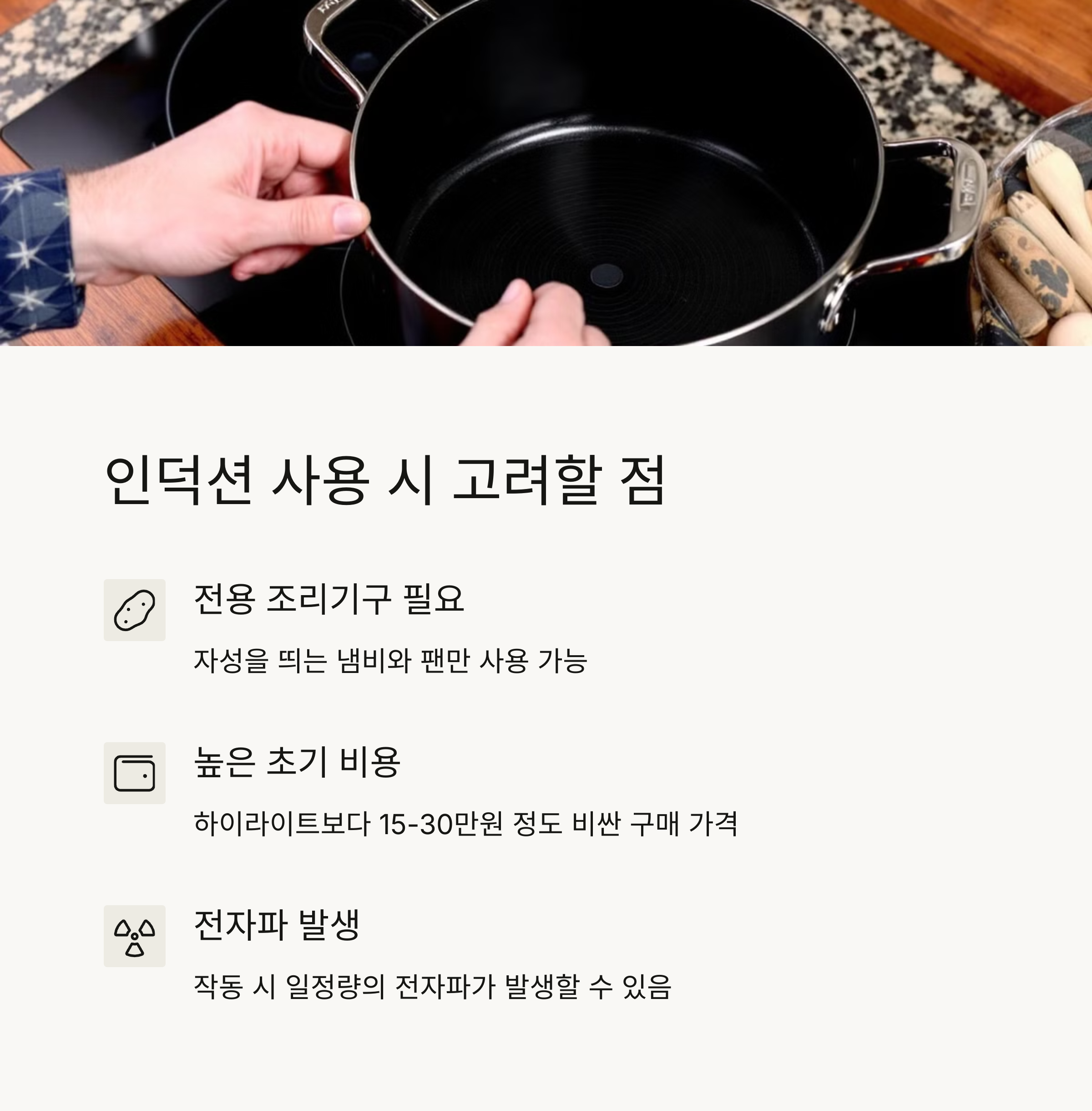 💡 실제 사용 팁: 인덕션은 처음 사용할 때 요리 시간이 생각보다 빨라 당황할 수 있어요. 처음에는 낮은 온도 설정으로 시작해 점차 조절해보세요!