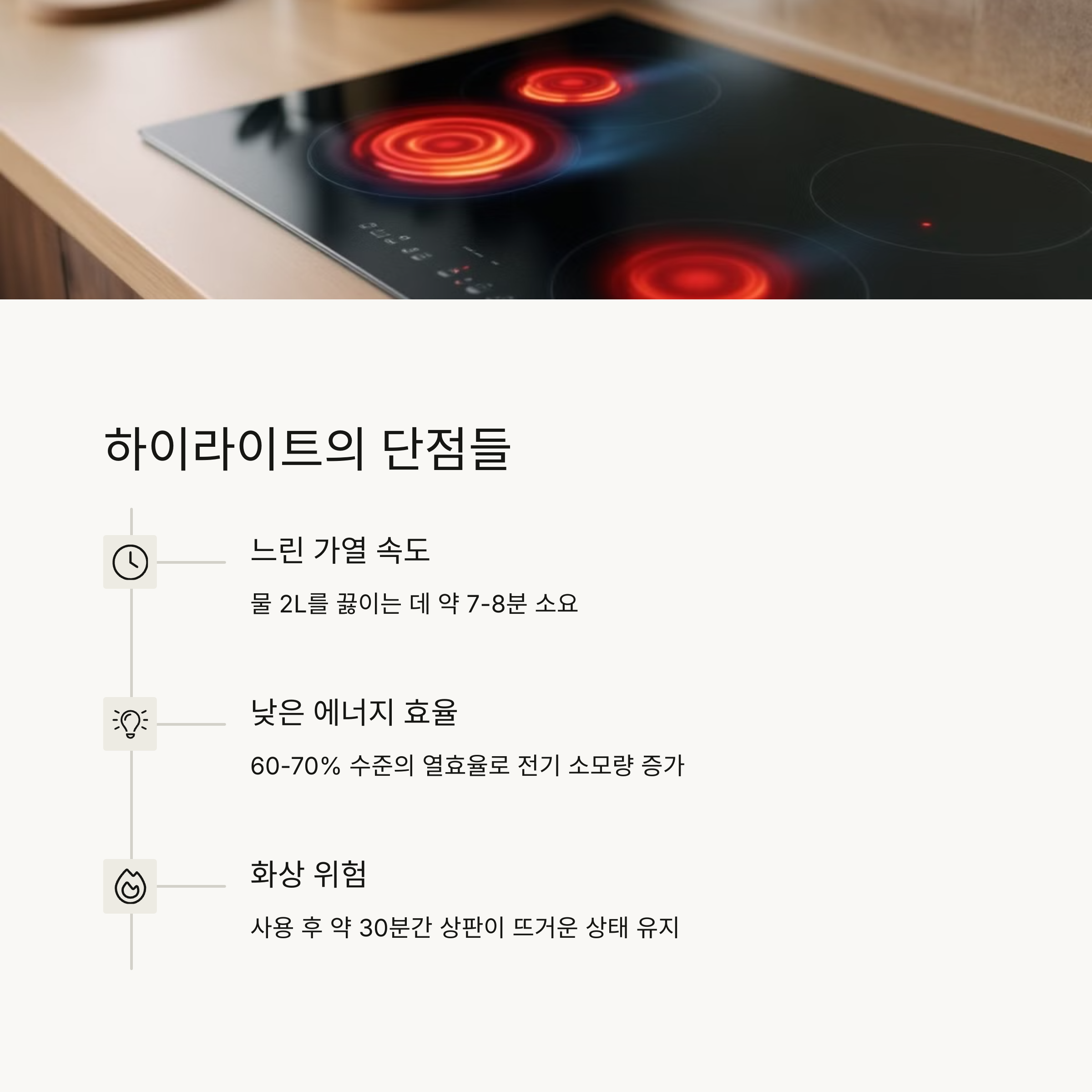 하이라이트는 인덕션보다 조리 속도가 느려요. 특히 물을 끓이거나 고온 조리에 시간이 더 오래 걸립니다