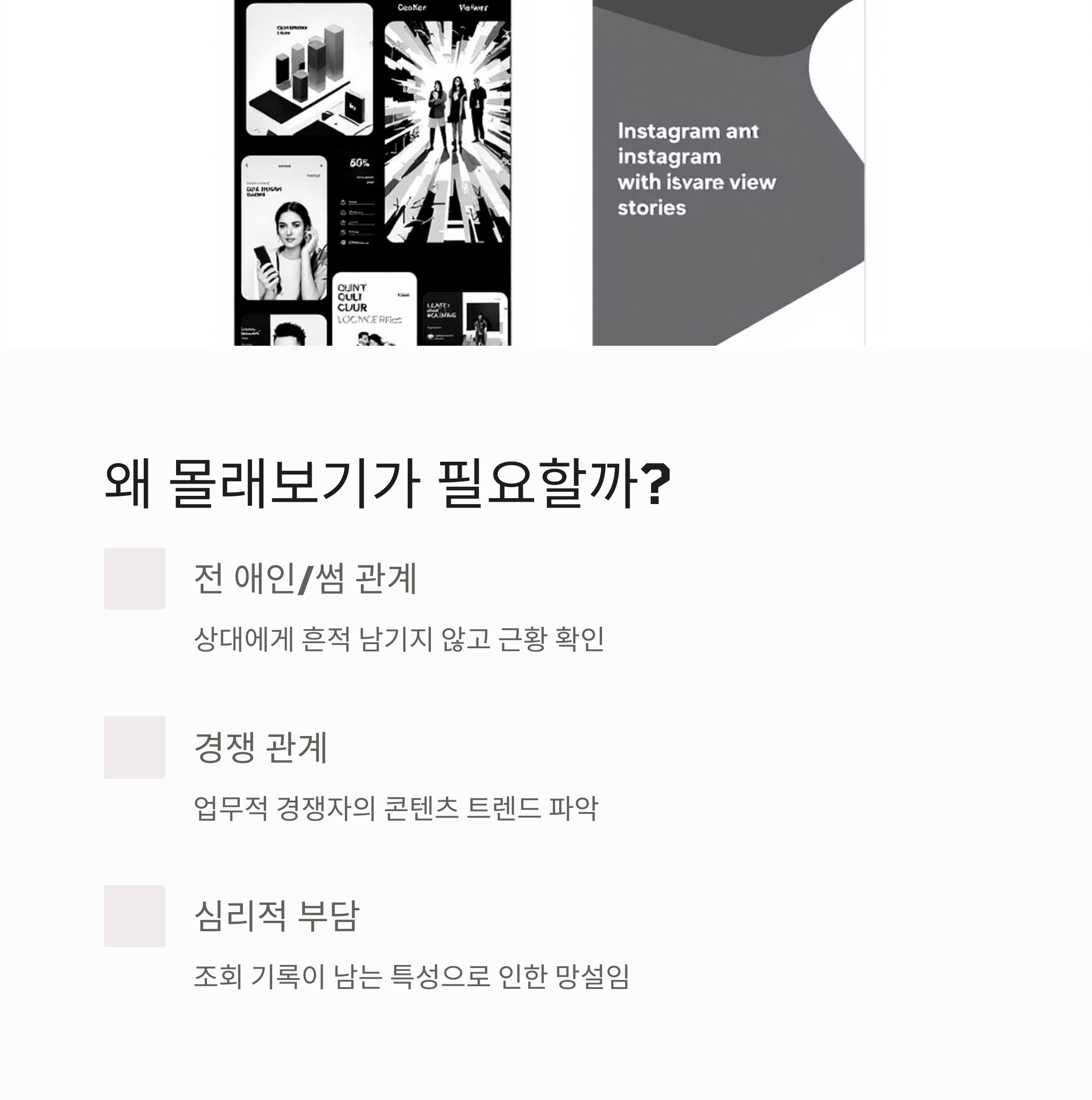 인스타그램의 스토리 기능은 24시간 동안만 유지되는 일시적인 콘텐츠인데요, 페이스북이나 다른 SNS와 달리 스토리를 본 사람의 계정 정보가 게시자에게 그대로 노출된다는 특징이 있습니다. 이 때문에 많은 사용자들이 '몰래보기'에 관심을 갖게 되었죠.