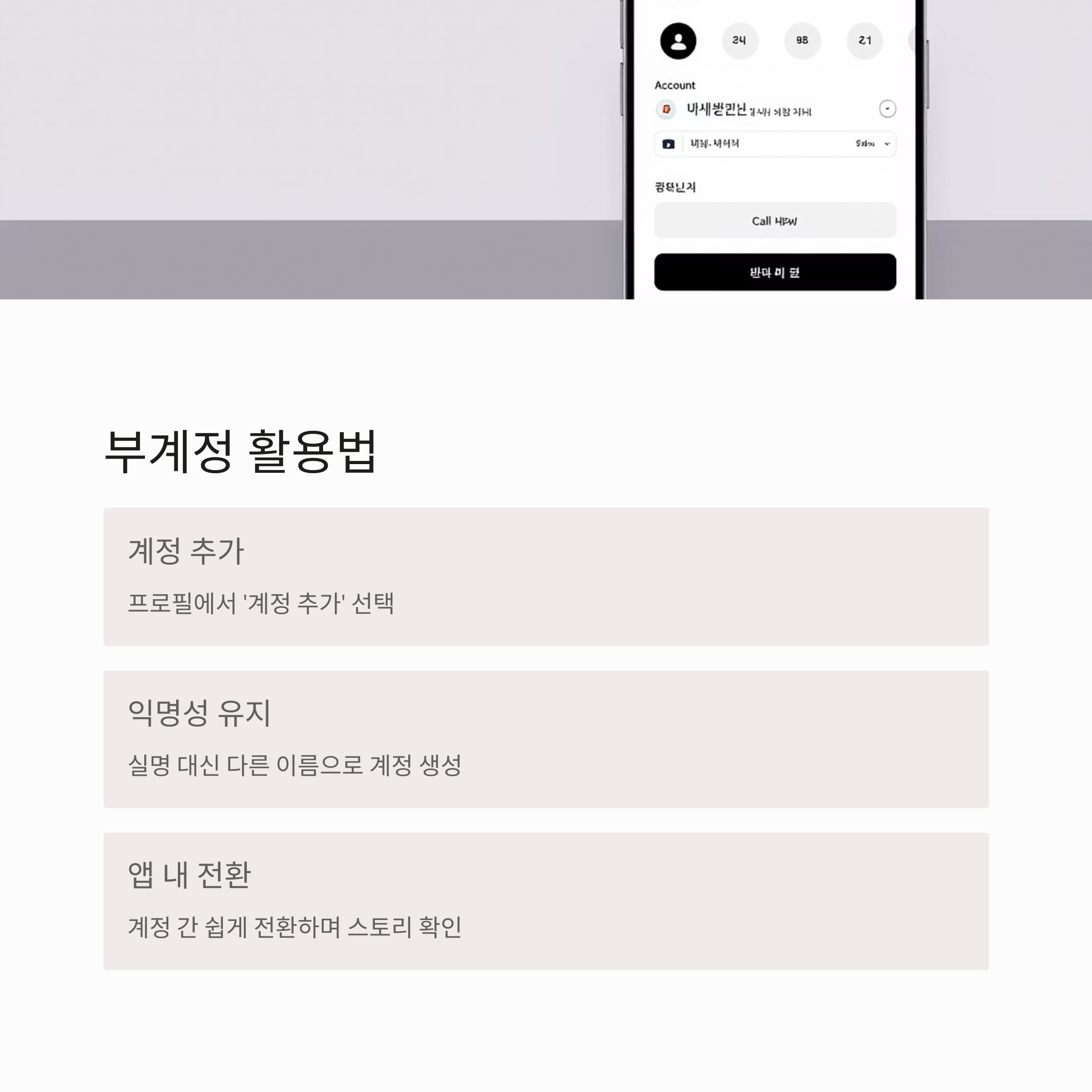 이 방법의 장점은 매번 웹사이트를 방문할 필요 없이 앱 내에서 바로 계정을 전환해 스토리를 볼 수 있다는 점이에요. 또한 부계정은 실명이 아닌 다른 이름으로 만들 수 있어 신원 노출 걱정도 적습니다.