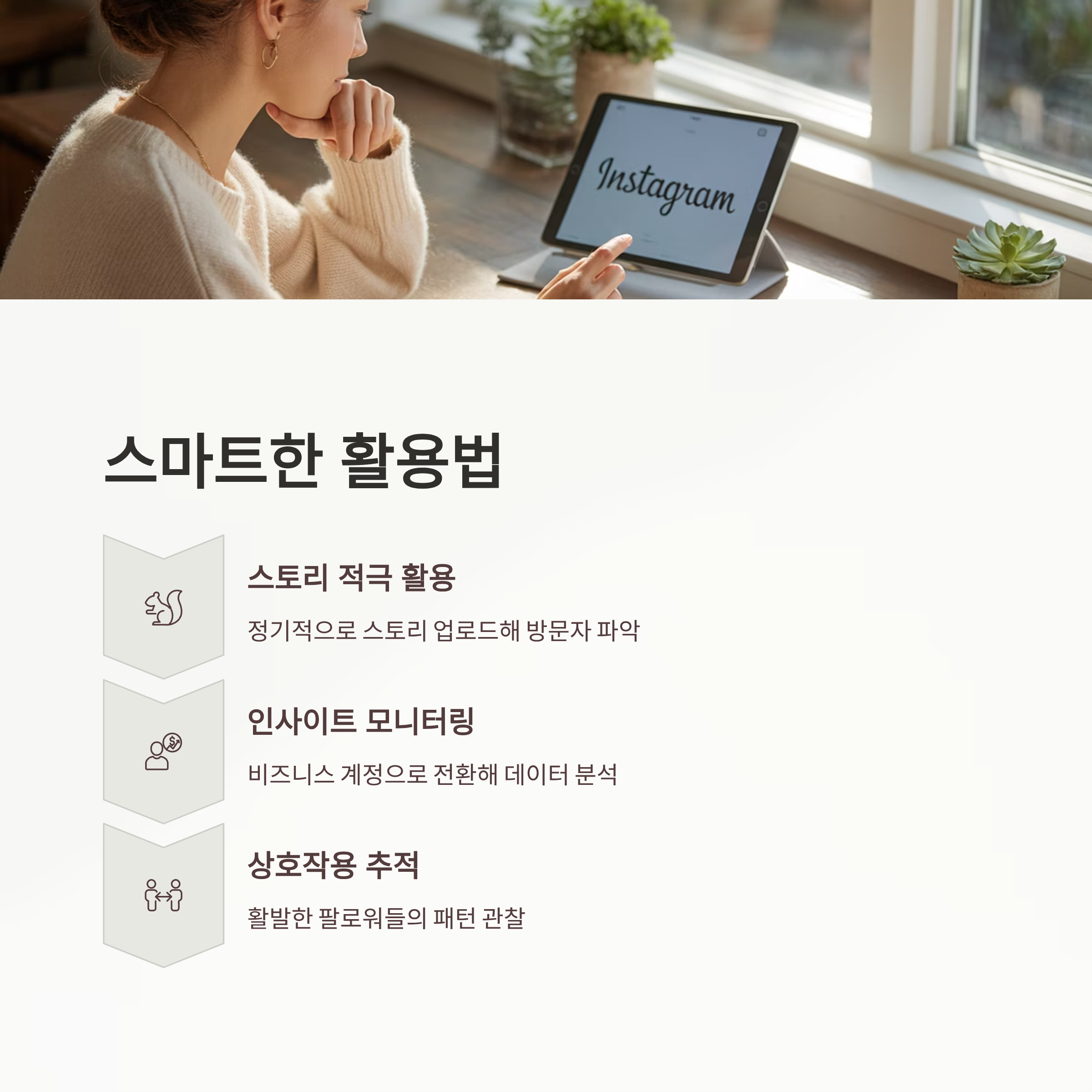 활용 팁: 게시물과 스토리 성과를 모니터링하며 주요 방문 시간대를 파악하고, 인플루언서 마케팅이나 콘텐츠 전략 수립에 응용할 수 있습니다.