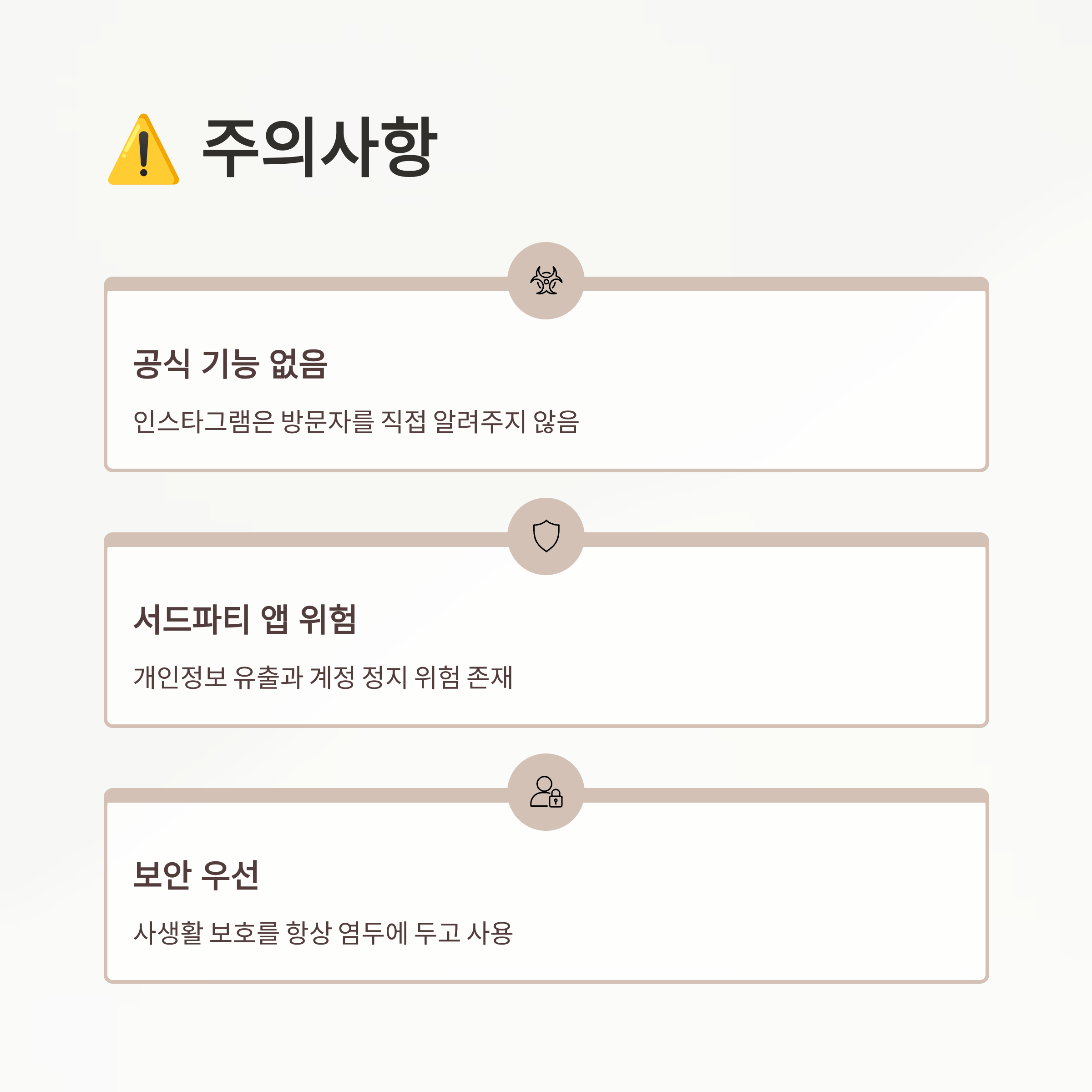 - ‘프로필 방문자’ 안내 앱이나 서드파티 앱은 개인 정보 유출이나 계정 정지 위험이 있으니 사용하지 않는 것이 안전합니다.