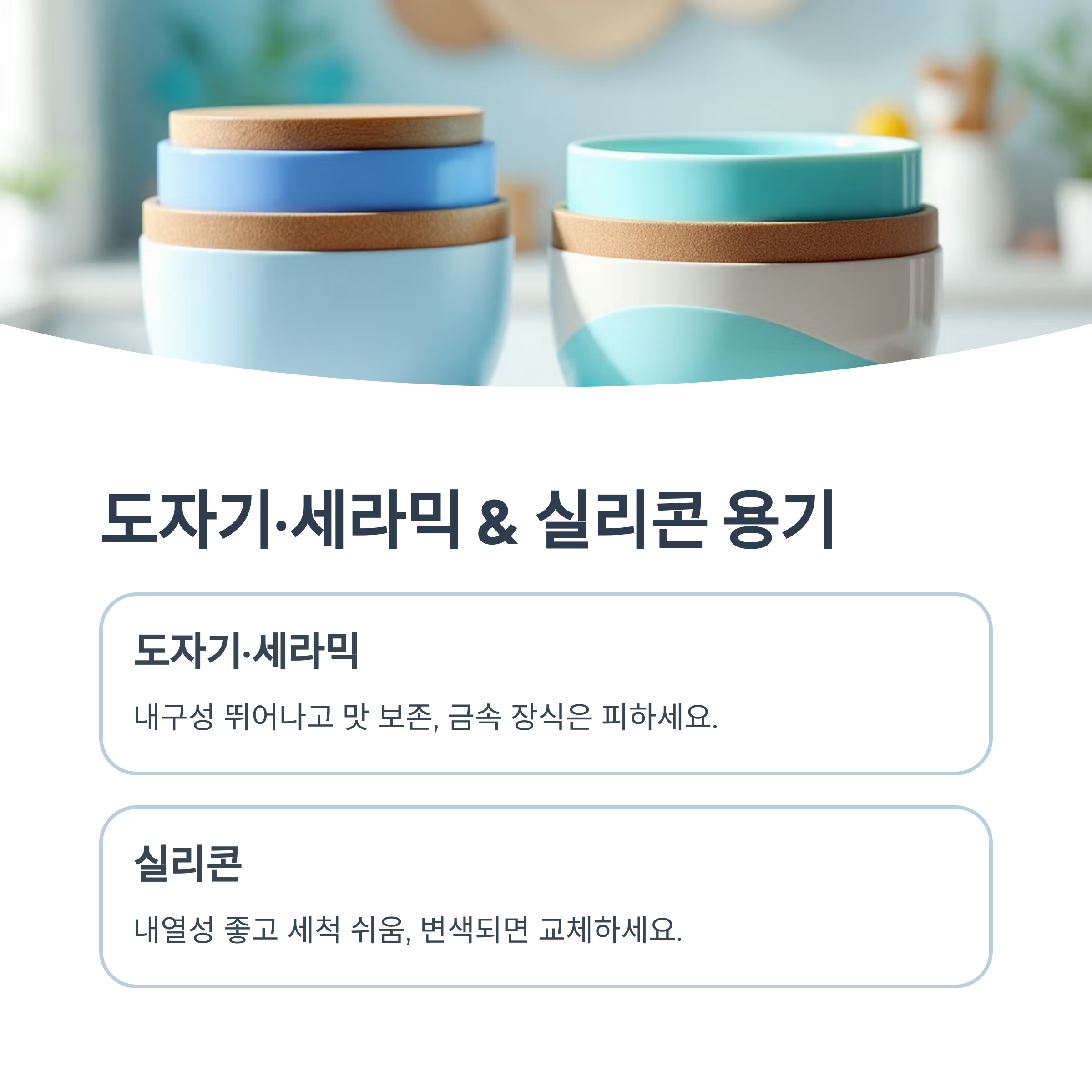 | 도자기·세라믹 | 내구성, 음식 맛 보존 | 무겁고 금속 장식 주의 | 밥·국 데우기에 좋아 자주 사용 |