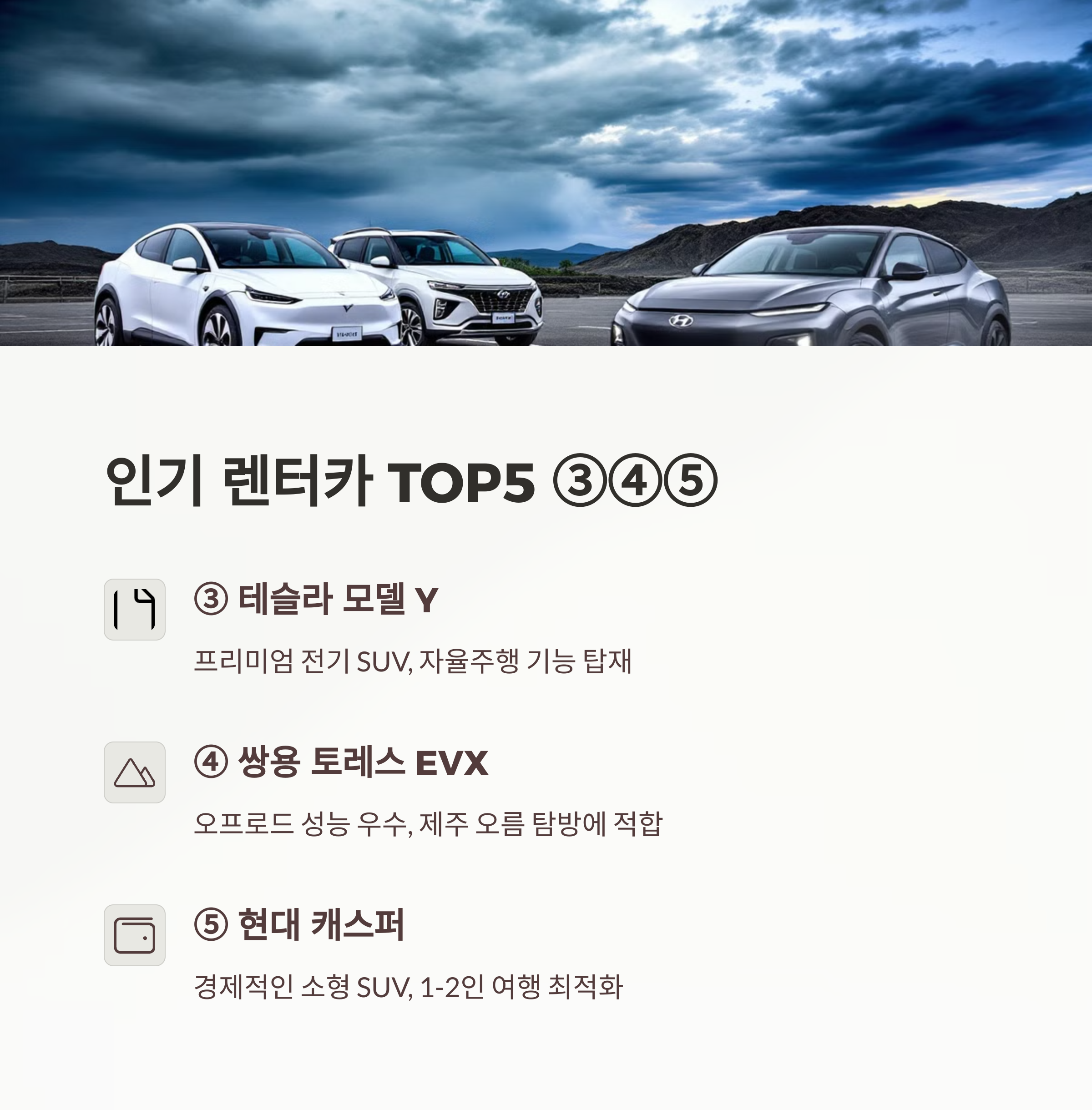 - 전기차의 경제성과 SUV의 실용성을 동시에 원하는 여행객