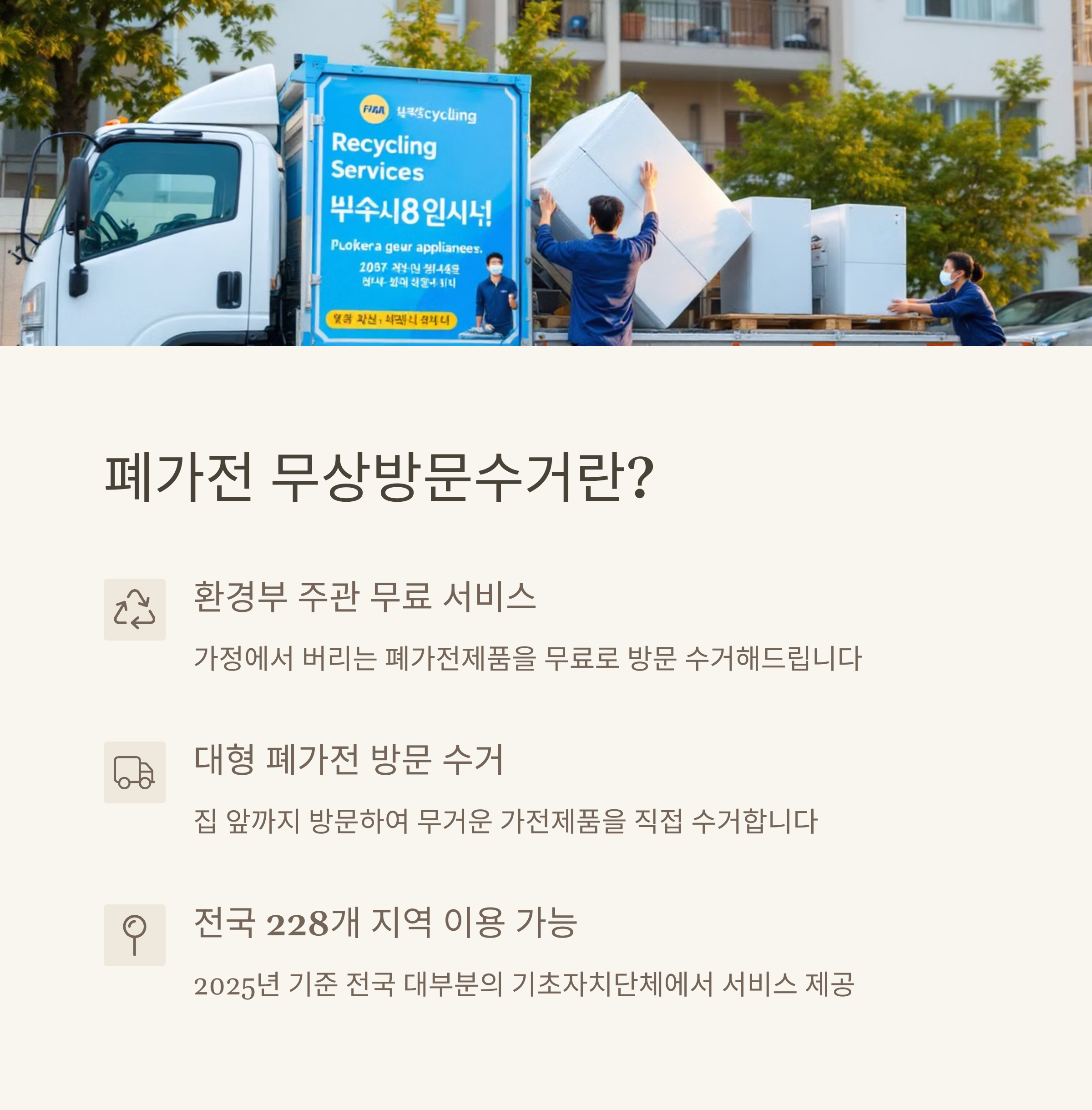 폐가전 무상방문수거 서비스는 환경부에서 운영하는 프로그램으로, 가정에서 사용하지 않는 가전제품을 완전 무료로 방문 수거해주는 서비스입니다. 2025년 현재 전국적으로 시행 중이며, 이 서비스의 가장 큰 장점은 다음과 같습니다:
