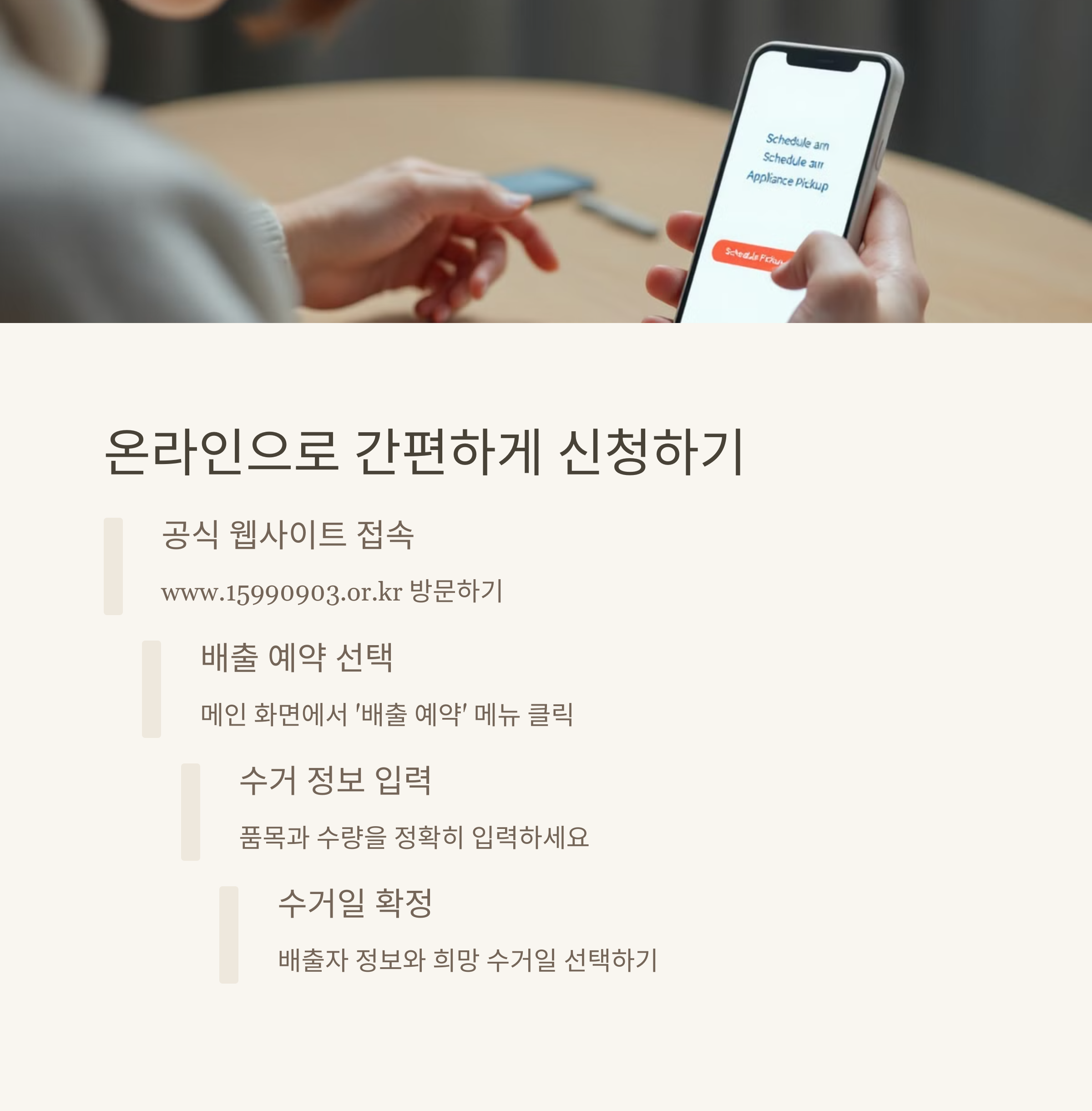 - 전화 시 준비할 정보: 배출할 가전제품 종류와 수량, 수거 희망 날짜, 주소