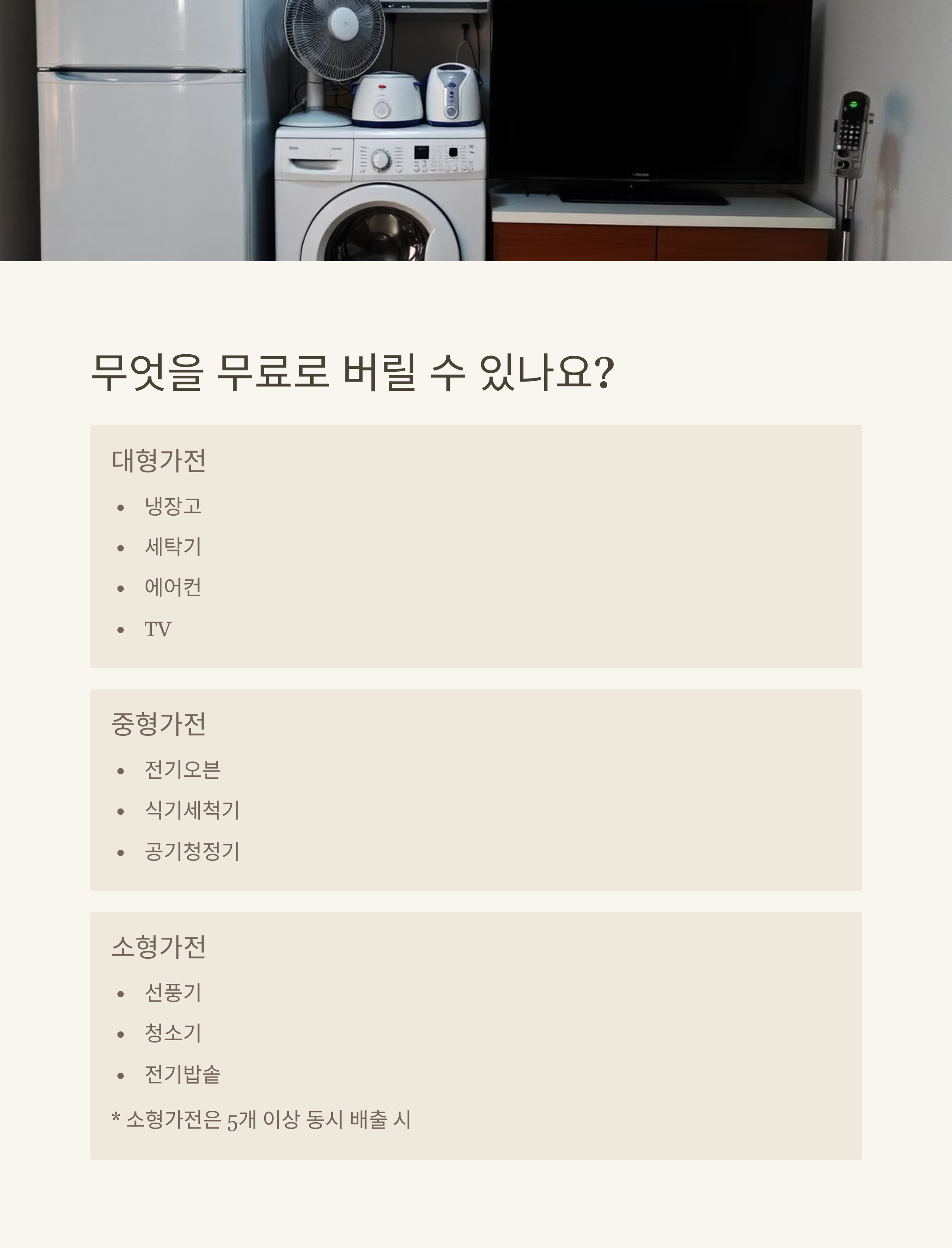 ✅ 네! 선풍기, 청소기, 전자레인지 등 소형 가전도 무상 수거 가능합니다. 여러 개를 한꺼번에 신청하시면 더 효율적이에요.